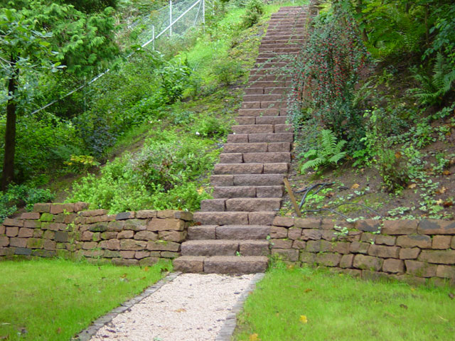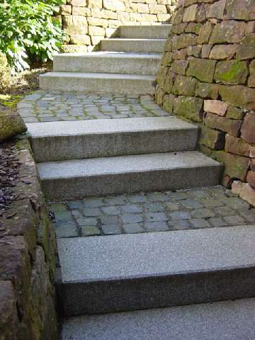 Eine gut geführte Treppe, die sich in die Architektur und den Stil des Gartens einfügt, wird ein wichtiges Gestaltungselement. Bei der Auswahl des Materials sind fast keine Grenzen gesetzt. Zur Verwendung kommen Naturstein-, Beton-, Holz-, oder Stahlkonstruktionen.